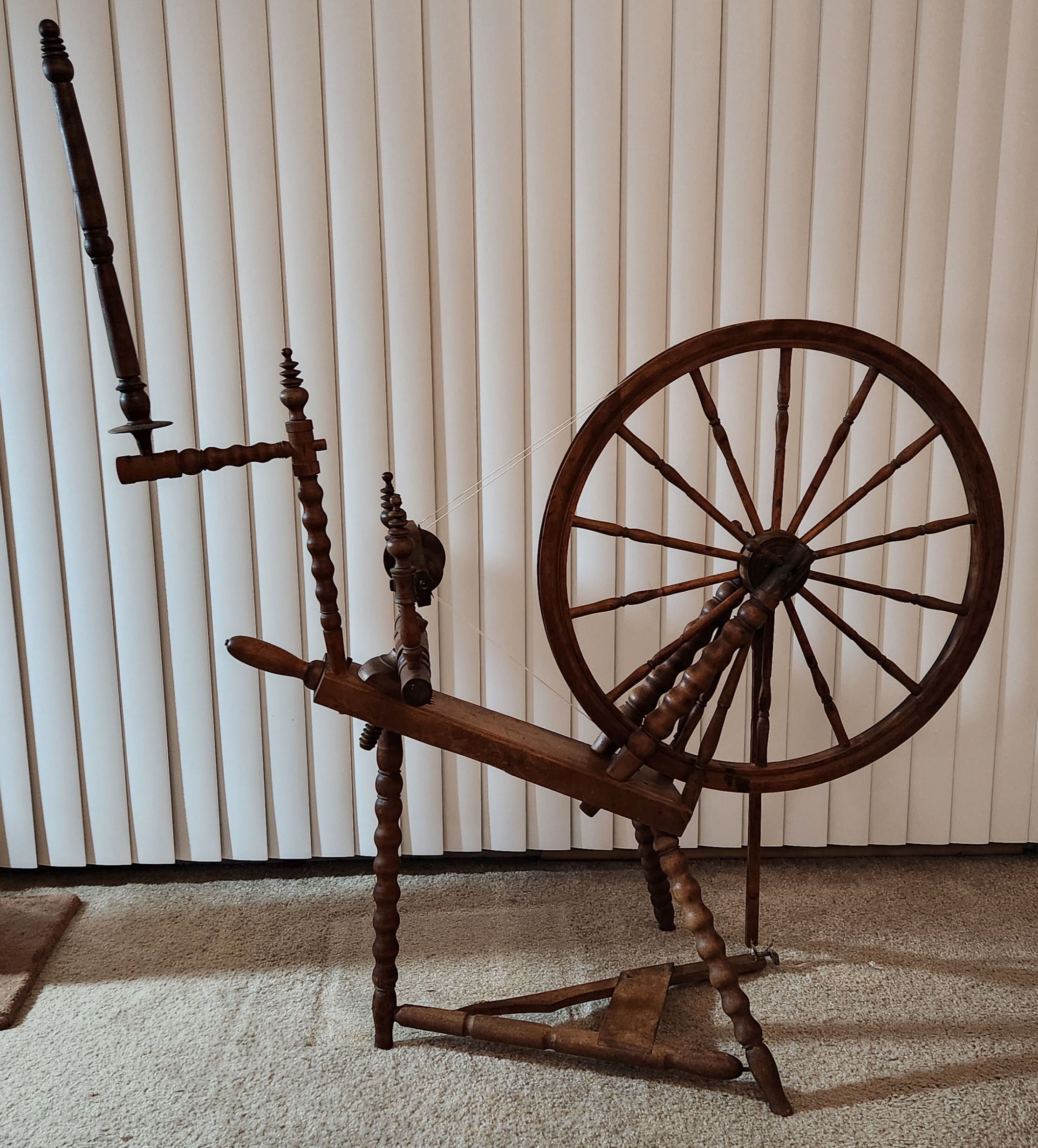 First, I was given a beautiful antique spinning wheel, which I’ve fixed up. It’s from the 1860s; I know when and where it was made, and it was an heirloom in a family that went west in the 1880s in a Conestoga wagon! I’m using the wheel now for my own projects, and I’m willing to spin commissions on it. (Your yarn has to be on the thin side, though, as the wheel won’t do thicker yarns.) For more on the wheel, check the related posts on my personal site. There are even videos of me using it.